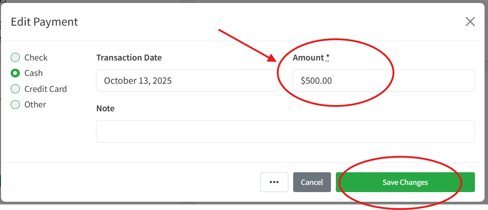Make the applicable Edit to your Recorded Payment. For example, in the screenshot below, you can update the Recorded $500 Cash Payment to a $500 Check Payment, or simply Edit the Recorded amount if originally entered incorrectly.
